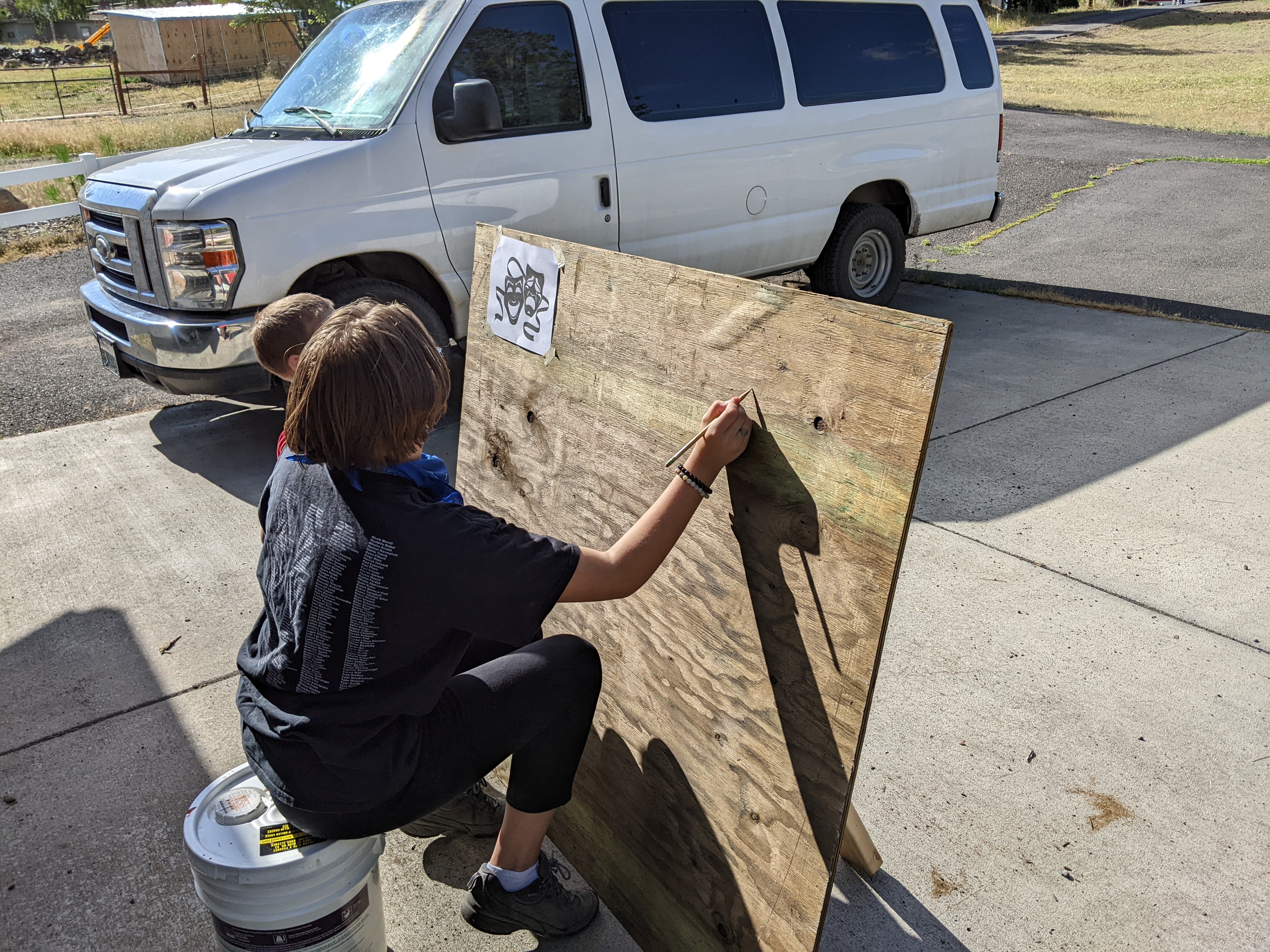 Our little town of Goldendale has an annual Community Day. This year we were asked to participate as members of the Goldendale Community Theater. The kids got to be in the parade and we had to man our booth for a bit. I volunteered to make a bean bag toss for the booth. I had Lizzy draw it out and help me cut it. I painted it out.