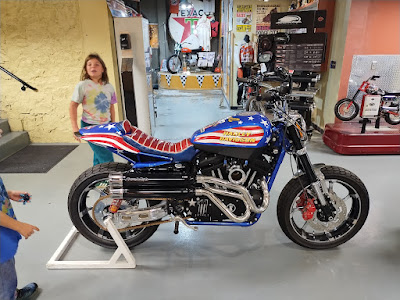 Daniel told me that there was an Evel Knievel Museum in Topeka, KS, but it was being relocated to Las Vegas in a month. I had to go see it. Luckily the kids had a day off from school so we headed west. It's a little over an hour away and so worth the trip. As I knew this would be the only time we would get to visit I made sure we did the virtual jump. I am so glad I got our tickets online. Their card system was down due to construction in the street. The museum was inside a historic Harley-Davidson restoration store. The store is relocating too. The kids had no idea who Evel Knievel was when we went, but as soon as we entered they began to realize why I was so excited to introduce them to his legacy.