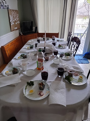 The Sedar was lovely, though of course my kids ate the paper bones. Denise had made a wonderful meal. The kids asked for seconds!